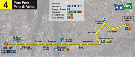 Koridornya cuma satu, Line 4, melanjutkan nomor urut koridornya trem: Line 1, 2 dan 3. (line 11 hingga 99 untuk buskota). Slogannya: busway pertama di Prancis, dari Nantes ke Vertou kurang dari 20 menit saja. Kabarnya BusWay Line 5 sedang dikaji untuk 2010. Panjang koridor cuma 7 kilometer, ada 15 halte. Mulai beroperasi 6 Nopember 2006 dengan 20 busgandeng BBG yang panjangnya 18 meter. Di jam sibuk headwaynya 4 menit, mengangkut 27ribu penumpang per hari.